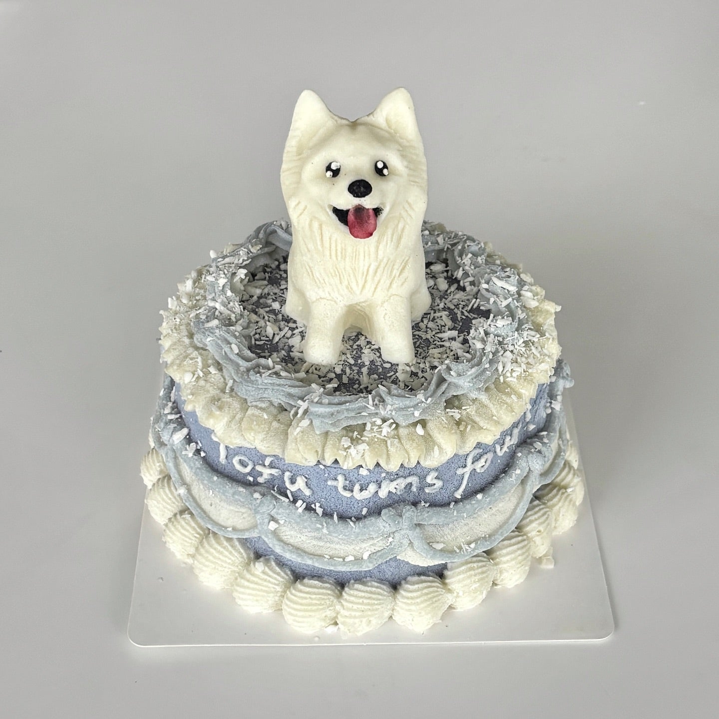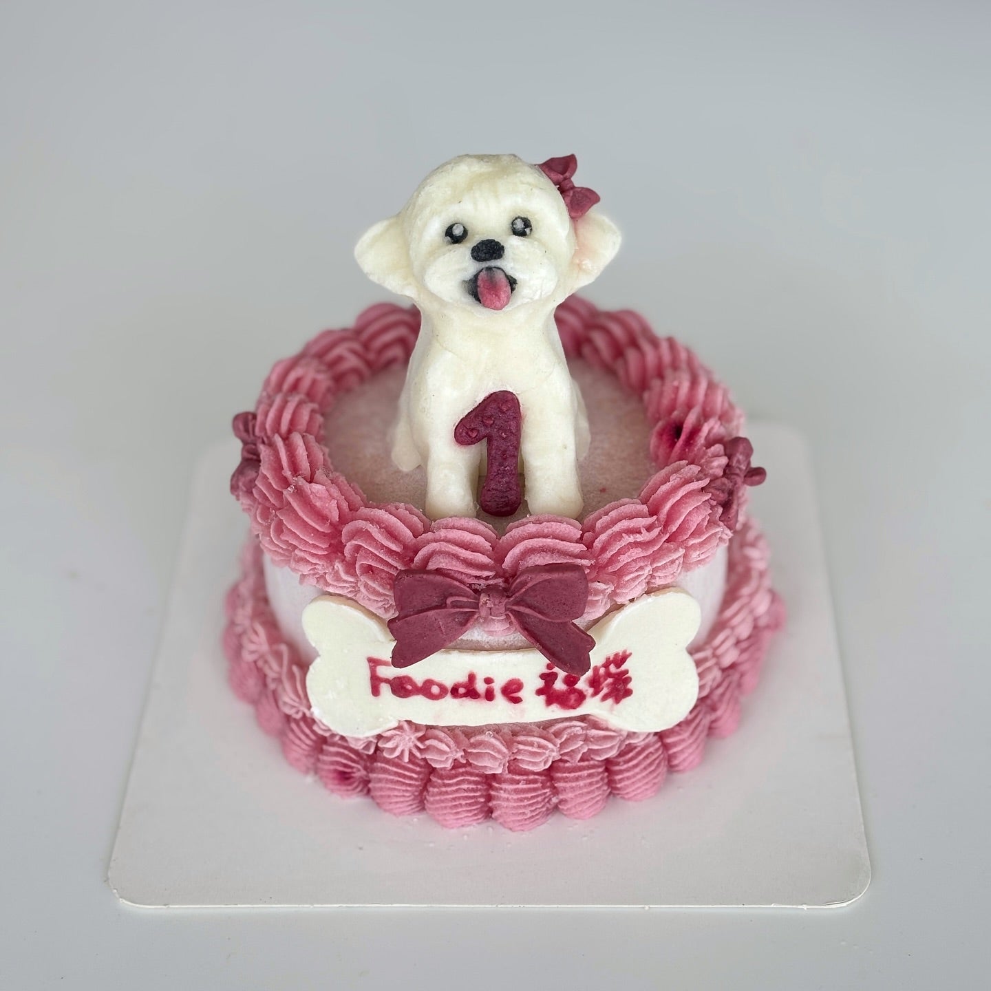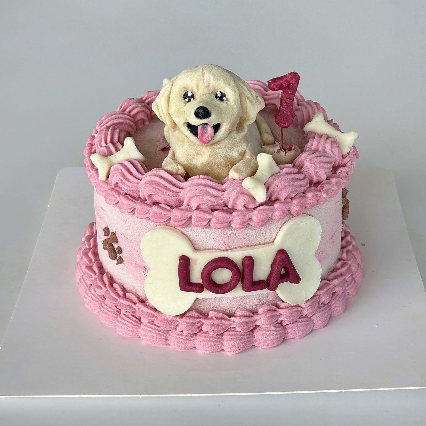 This cake brings on the swirls, ruffles, and soft pastel magic — inspired by vintage bakery vibes but made 100% pup-safe.
